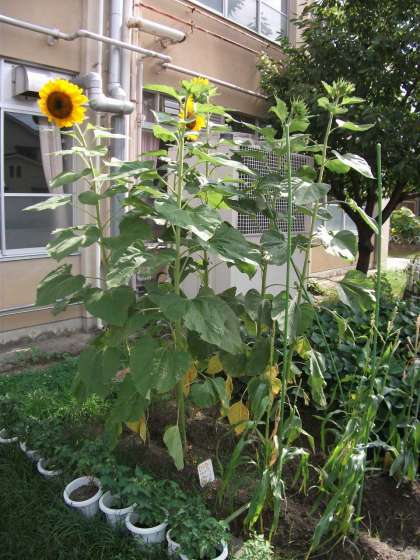 なかなか咲かなかった2年生のヒマワリも,登校日を知っていたかのように咲き始めました。