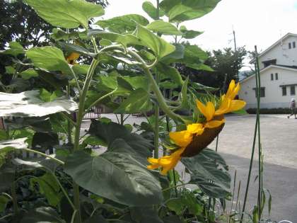 最後に咲いた2年生のヒマワリは大きく育っています。大きな花をつけて実ってきたので,頭を垂れて重さに耐えながら咲いています。