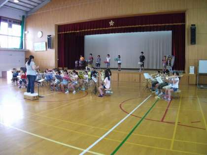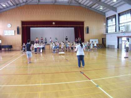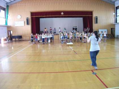 コンクールを目指して体育館で特訓を受けています。