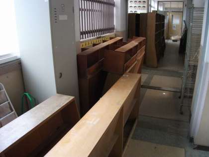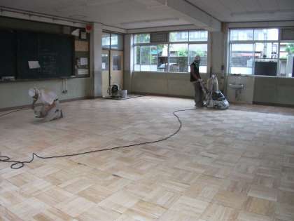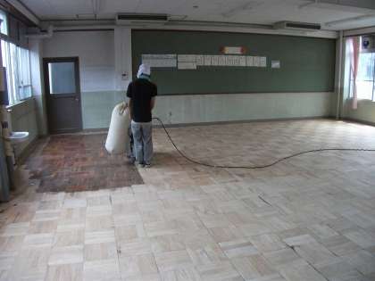 本は先日1年生の教室に運びました。今日は,机・椅子と本棚を廊下に運び出して,床を磨いています。その後,コーティング仕上げをしてもらいます。