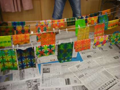 絵画教室のほうは,画用紙にマーブリングしたり,色染めをしたりした後,色染めした和紙を切り紙にして貼りました。