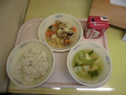 今日の献立は「麦ごはん・牛乳・プリプリ中華いため・とうふと青菜のスープ」でした。「プリ中だ!」と楽しみにしていた様子で,「プリ中のたまごとこんにゃくのバランスがおいしい」「プリ中とスープの相性がいい」とぺろり。1年生は初めてのメニューでしたが,「おいしい」とにっこり。おかわりをたくさんして,今日もおいしくいただきました。