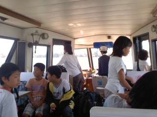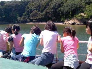 船に乗りました。天気がいいのでとても気持ちがいいです。船の上では風がきついですが,たくさんの島や,真珠の養殖も見ることができました。