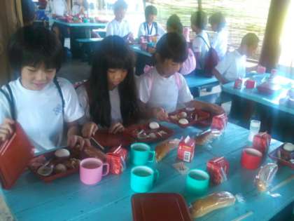 2回目の食事です。ロールパンにサラダ,ゆで卵やソーセージをはさんで食べます。寝不足の子はボーとしていますが,全体的にとても元気で食欲もありました。