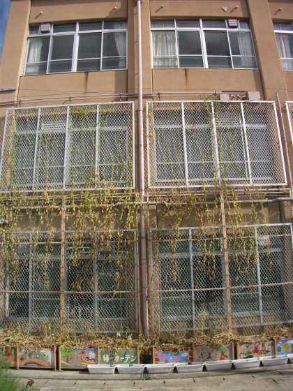9日に教育後援会の方が弦を切ってくださいました。上の方の葉っぱも枯れてきました。職員室から見ると,枯れた葉っぱが残っていますが,カーテンが取れて明るくなりました。