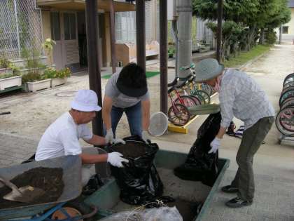 ふれあいガーデンにに向けて,土作りをしていただきました。根を取り除いて,ふるいにかけ,黒いビニルに入れて,消毒します。次は,どんな花壇になるのかが楽しみです。