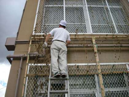 職員室を強い日差しから守ってくれた緑のカーテンですが,全部取り除いていただき,すっきりしました。緑のカーテンのおかげで,今年は猛暑にもかかわらず,エアコンを入れる時間が随分減り,節電に貢献できました。教育後援会の皆さん,本当にありがとうございました。