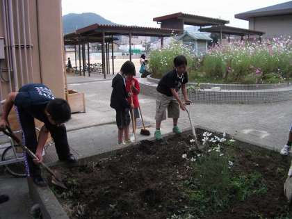 夏の花が終わったので,ヒマワリを抜いてタネとりをしました。そして,次の作物のために肥料や土を足して耕しました。