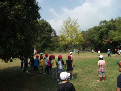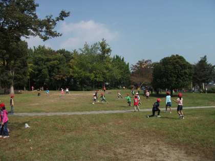 公園の広場で荷物を置いて,クラスごとに全員遊びをしました。おにごっこでした。大きな木が陣地になったので,木の周りにたくさんの子ども達が集まる形になりました。