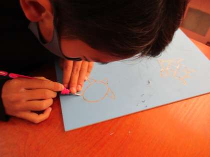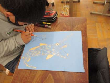 4年生は,初めて彫刻刀を使って木版画に取り組んでいます。丁寧に下絵を描いた後,慎重に彫刻刀で彫りすすめています。紙にすったときにどのような仕上がりになるかが楽しみです。