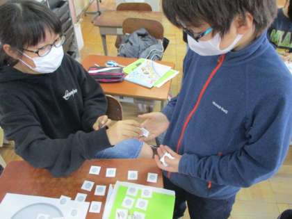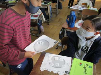 外国語活動「What do you want?」の学習で,オリジナルピザを作るために,自分の欲しい野菜を伝える活動をしました。お店役・お客さん役に分かれて,何をいくつほしいのかを伝え,材料を集めました。楽しみながら会話をし,自分の好きなピザを作ることができました。