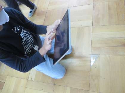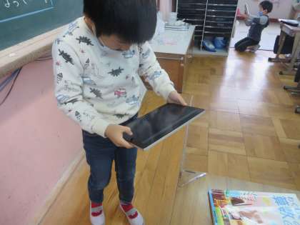 算数科「三角形と四角形」の学習で直角さがしをしました。三角定規を使って,身の回りから直角をたくさん見つけていました。「床にも直角があるよ!」「机の角も直角だね。」など,楽しく活動しました。見つけた直角はタブレットで撮って,みんなで見合いました。