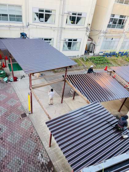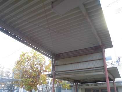 校舎東側の渡り廊下屋根ですが,経年劣化により,雨漏りが絶えず,