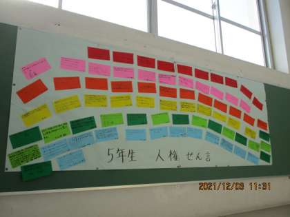 今月は人権月間です。これまでの人権朝会のことをふり返りながら,この人権月間で人権に関わる内容の「こんなことをがんばりたい」ということを「人権宣言」として掲示しました。