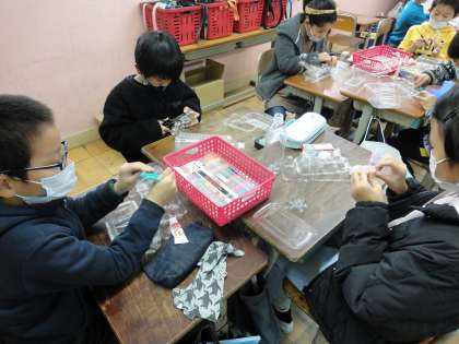 図画工作「クリスタルアニマル」の学習では,ペットボトルなどの廃材を利用してかわいい作品を作っています。