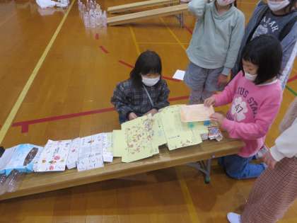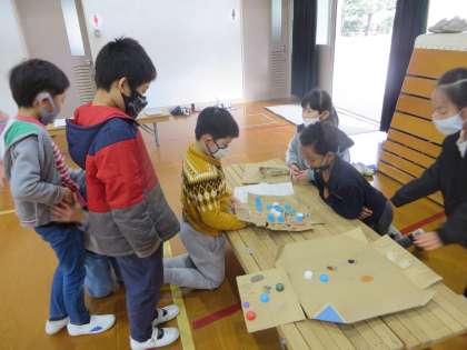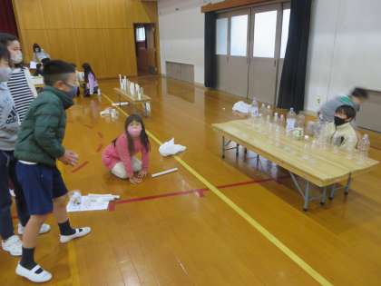 生活科「あそんでためしてくふうして」の学習で,自分たちが作った動くおもちゃを使っておもちゃ屋さんを開きました。走る車でボーリングを作ったり,跳ぶおもちゃでまとあてを作ったりと,思い思いの遊びができていました。お店屋さんとお客さんをそれぞれ体験して,「楽しかったあ!」「最高得点をとれたよ!」!「楽しいと言ってもらえてうれしかった!」など,うれしい言葉をたくさん言っていました。