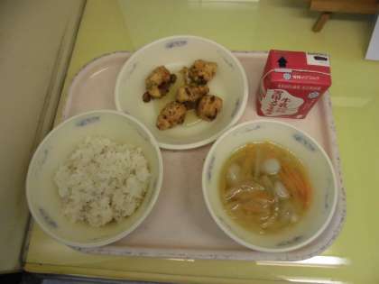 がんもどきは,とうふ,鶏ひき肉,おから,にんじん,しいたけ,枝豆を混ぜ合わせ,給食室で一つ一つ丸めて作りました。