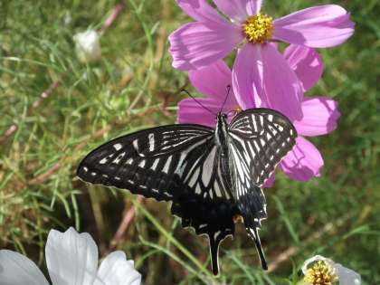 コスモスの満開が過ぎて,早くも来年のためにタネができ始めています。タネとりをしているとアゲハチョウが蜜を求めて飛んできました。静かにカメラを構えても逃げることなく,花から花へと蜜を集めていました。他の種類のチョウもいました。きれいな花を喜んでいるのは人間だけではないのですね。