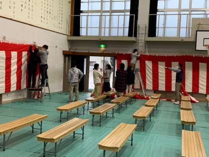 5年生が体育館を出たあと,放課後に教職員で卒業式準備の仕上げをしました。担任の先生も事務職員さんも管理用務員さんも教務主任の先生も教頭先生も,何だか楽しそうに準備をしている様子を見ていてしあわせな気持ちになりました。