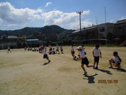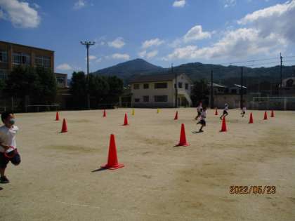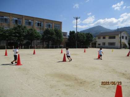 体育科では,リレーあそびをしています。コース上に置いた3つのカラーコーンをよけながら走ったり,1回転しながら走ったり,いろいろなリレーを楽しんでいます。勝つためには,コーンはできるだけ小さく回ることや,バトンは手を伸ばして渡すなど自分たちで工夫を考えながら取り組んでいます。
