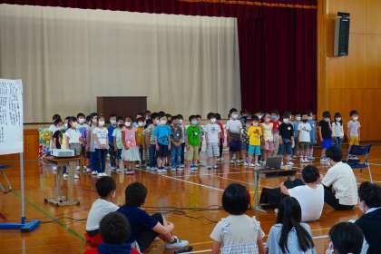 1年生を迎える会がありました。全校のみんなに1年生の元気な姿を見てもらうことができました。会場では,6年生が歌のプレゼントをして歓迎してくれ,会場は温かい雰囲気に包まれました。