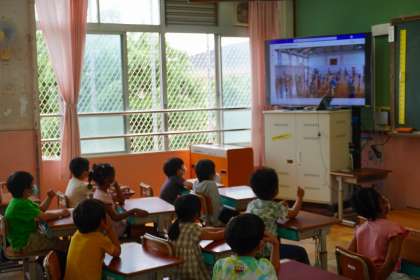 お礼に「きっとできる」を歌いました。緊張しながらも大きな声とかわいらしい笑顔で歌うことができました。大きな拍手をもらって嬉しそうにしていました。教室に戻ってからは,メダルのプレゼントがあり,2年生から5年生がビデオでお祝いしてくれました。