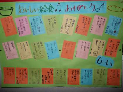 先週の給食週間は,給食のことを深く知り,毎日いただいている給食について改めて考える機会でした。南校舎1階東側の給食室に近い掲示板に,感謝の言葉を掲示しています。
