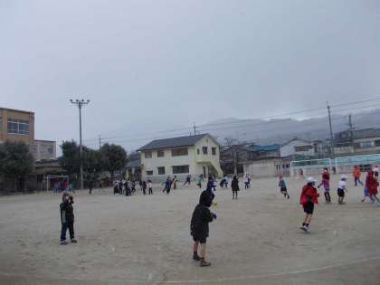 各地から大雪の便りが届いていますが,京都では小雪が舞う程度でなかなか積もりません。子ども達は小雪が舞う中,元気に運動場で遊んでいます。