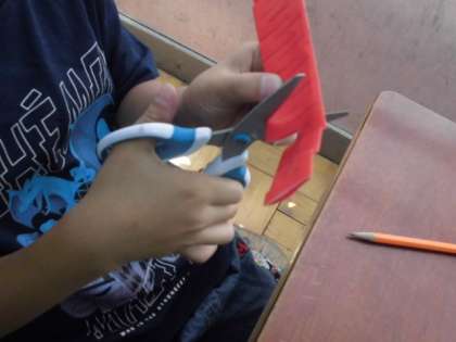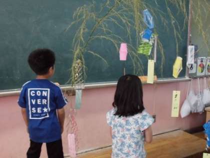 今日、校舎をまわっていると、に組の子どもたちと2年生が、一緒に七夕の笹かざりを作っていました。