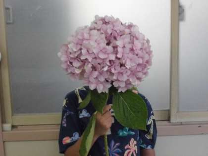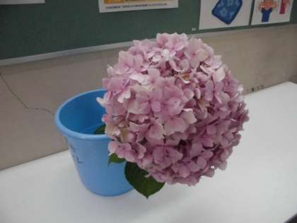子どもたちの顔がすっぽりと隠れるほどの、大きな大きなアジサイの花が、学校の東側の道路沿いに咲いていました。あまりの大きさに、普通の花びんではバランスがとりにくく、バケツにさして職員室前にかざっています。
