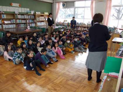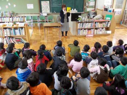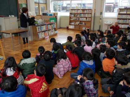 本校のために今回選んでいただいたテーマは,『魔法』。テーマに合わせて古今東西の趣の違う本と紙芝居を持参して,本校の1年生と2年生の前で行っていただきました。しっとりとした語り口ながらテンポのよいブックトークに,子ども達はお話の世界に引き入れられて長時間集中していました。写真は2年生のものです。