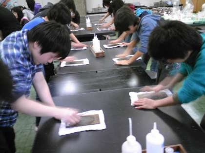 ろ組の学習は、「地球の運命を変えた石」。石灰岩について調べ、研磨標本を作りました。