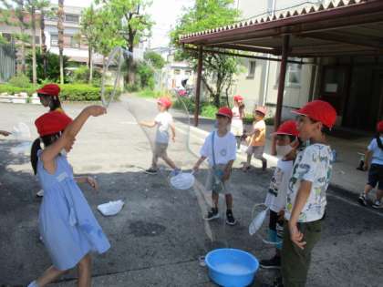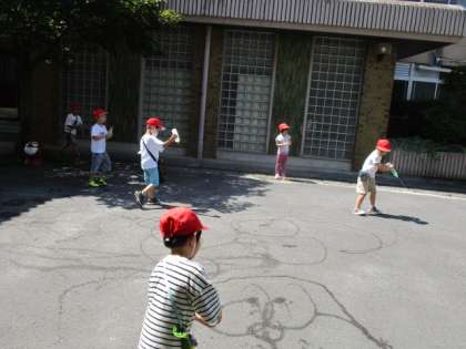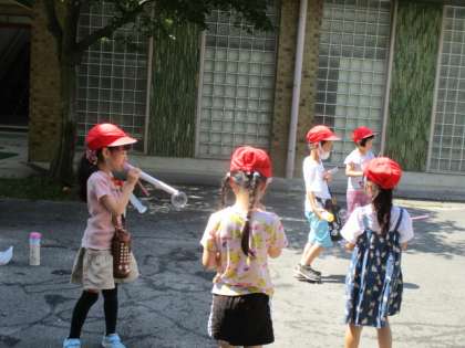 7月18日(火)は、朝からせみの鳴き声が聞こえて暑い日になりました。生活科「夏だ とびだそう!」の学習で、水を使って遊ぶ活動をしました。空き容器を使って水鉄砲でどれだけ飛ばせるか競争したり、地面に絵を描いたり、大きなシャボン玉を作って遊んだりしました。大きなシャボン玉を作るのには、何かコツがあったようです。この後、遊びの中から発見したことや気づいたことをみんなで交流する予定です。