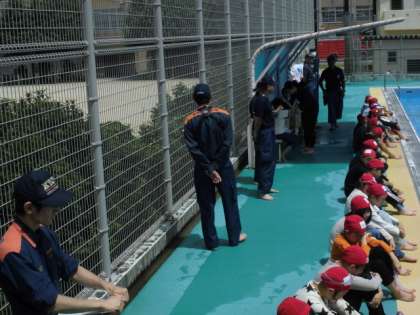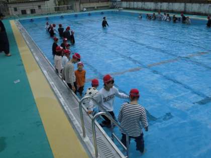 19日(水)に、左京消防署、修学院第二消防分団のご協力をいただき、6年生が着衣水泳を体験しました。
