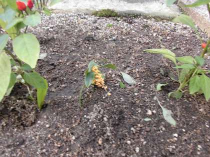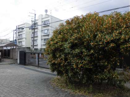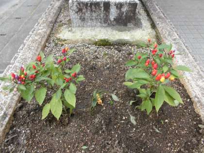 中庭のいい香りを放っているキンモクセイの枝が折れていたのでしょうか。小さなキンモクセイの枝が、いつの間にか植えた苗のちょうど中央にちょこんと差してありました。誰が差したのかはわかりませんが、いたずらっぽく笑みを浮かべながら差したのだろうなとその姿を想像すると、私も思わず笑顔になり、写真を撮りました。
