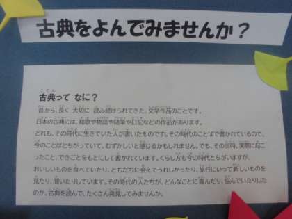 学校司書の谷原先生が図書館に、「古典コーナー」を作りました。