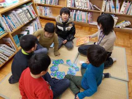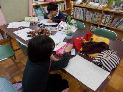 雨の放課後の図書室です。子ども達は雨でも元気いっぱい。勉強したり,読書したり,遊んだりしながら学んでいます。