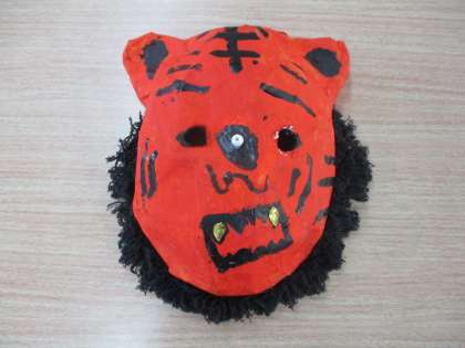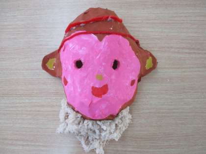 図画工作の時間におめんを作りました。初めに、自分の顔の大きさに合わせてボール紙で作った型に、和紙を貼っていきました。「ぬるぬるしてる。」「つめたい。」など、のりの感触を楽しみながら重ねて貼っていきました。