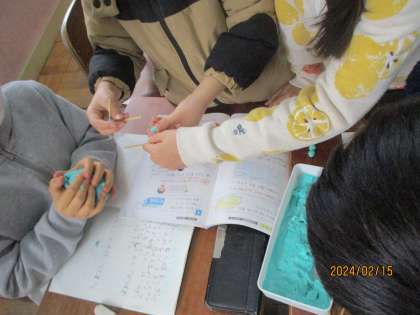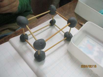算数科「はこの形」の学習では、ひごと粘土玉を使って箱の形を作りました。辺がいくつあるのか、ちょう点がいくつあるのかをみんなで確かめました。