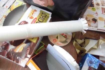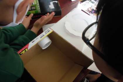 箱以外にも,ラップの芯や,トレー,画用紙など他の材料も組み合わせてこだわって作っています。
