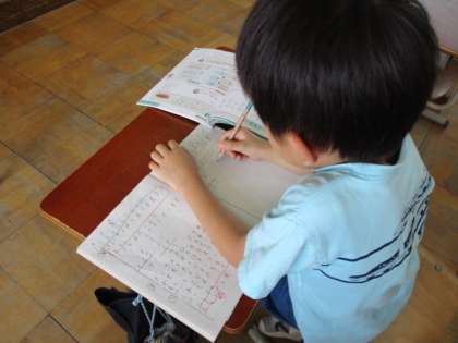 算数の学習の様子です。位をそろえて筆算をしています。ノートのマスの大きさも1年生のころより小さくなりましたが、がんばって書いています。