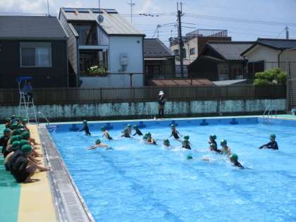 「わー!!」と楽しそうに水泳運動を楽しんでいる3年生。元気よく水の中へ入っていきました。安全に気をつけながら、楽しみつつ学習を進めてほしいです。
