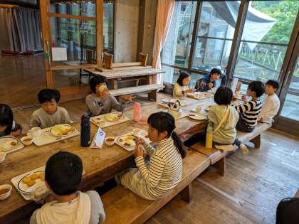 山の家の食堂で食べるのは、これが最後です。パンとご飯、味噌汁とコンソメスープそれぞれ好きな方を選びました。