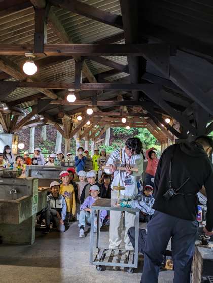 まずは、所員の方の説明を聞いて、先生が挑戦!大人でも難しい……。