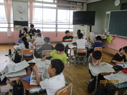 国語科の学習で新聞の作り方を学習しています。まずは、新聞にはどんな特徴や工夫があるのか、新聞の秘密をさぐってみました。最近は新聞をとっていないご家庭も多いので、新聞を手に取ってじっくりと読んでみるのは初めてというお子たちも多くいました。これから実際に新聞作りをしていきます。どんな新聞が出来上がるのか楽しみです。