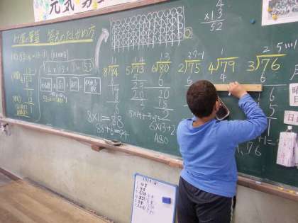 ノート指導では,同じ大きさの数字をていねいに書くことと,定規を使って線を引くことを強調しています。美しくていねいに書かれたノートはまちがいが少ないだけでなく,まちがいを発見しやすくなるためです。そのため,黒板に直線を引く時にも,手作りの筆算用定規を使っています。