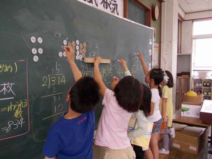 機械的に筆算を学習するだけではなく,具体物を使って分けていく活動と筆算の計算が合致していることを確かめています。