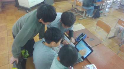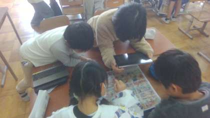 人権の日の取り組みで国際理解の学習をしました。スーパーのチラシを見ながら産地を調べ、世界地図に印をつけました。中には初めて聞いた国もあって、色々な国から食品がやってきていることに驚いていました。学習の後には、「日本の反対のほうの国からも近い国からもいろいろな国から輸入されていて、世界は広いと知った。」といった感想や、「名前も知らない国があって、日本とはまったく関わっていないと思うような国も実は関わっていたと知って、とても不思議な感じがしました。」といった感想が聞かれました。「もっと調べたい!」と、チラシを何枚も取り来るグループもあって、楽しく学習を進めました。