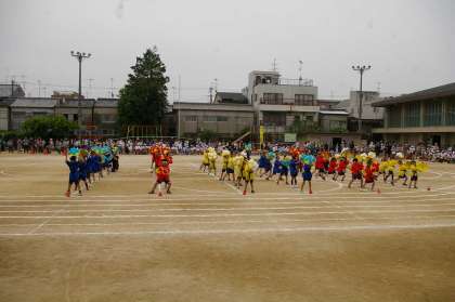 2年生は,山形県の有名な踊り『花笠音頭』を踊りました。自分達で作った花笠を持って,はっぴ・ねじりはちまき姿で一生懸命踊りました。隊形の移動もがんばりました。