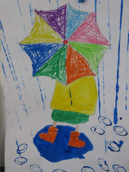 クレパスや絵の具を使って、傘や傘をさしている自分の後ろ姿を描きました。筆を上手に使ってはみ出さないように色を塗るなど、集中して描いていました。